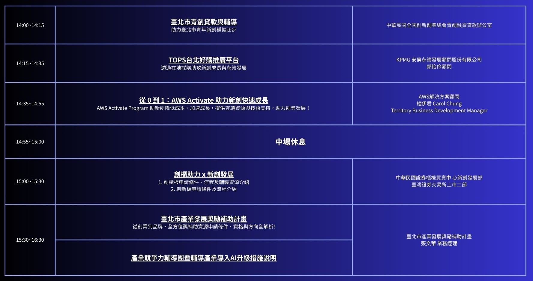 本次說明會將說明臺北市青創貸款與輔導資源、TOPS台北好購資源以及全方位的獎勵補助資訊;