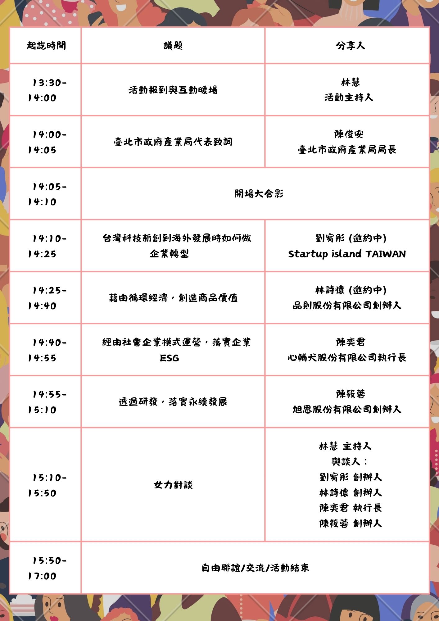 透過女力代表的創業故事與實戰經驗分享,讓不同產業、不同階段的創業者彼此交流,拓展合作契機,強化女性創業支持網絡,共同為臺北市打造更具韌性、多元性與永續性的創新生態。