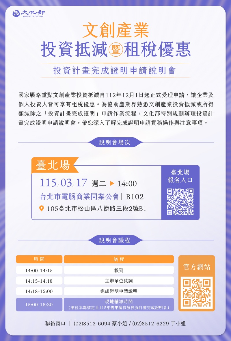 鑒於投資抵減租稅申請流程包含投資計畫審查及完成證明兩階段,為協助文化創意業者及投資者了解文創產業投資抵減或所得額減除之「投資計畫完成證明」申請作程,文化部特別規劃辦理投資計畫完成證明申請說明會,介紹投資計畫結案報告、申辦文件、作業流程與常見問題說明等相關資訊。