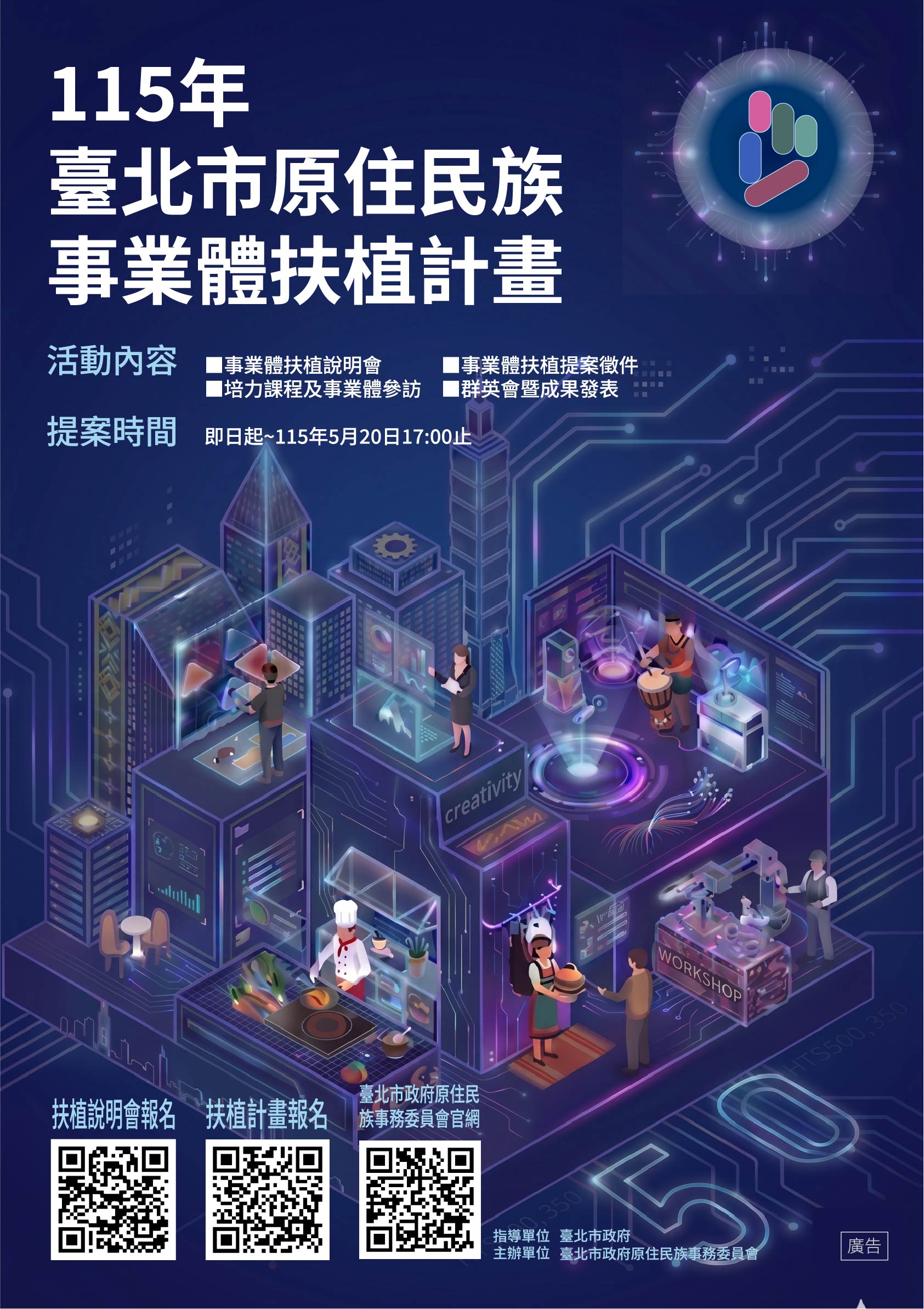 📌 申請資格:「創業啟蒙類組」提案人須設籍於臺北市,年滿18歲,並具原住民身分,且有創業意願者;「實績發展組」為依法於臺北市設立登記之公司、有限合夥、商業或合作社,其負責人或代表人須設籍本市,並具原住民身分者。